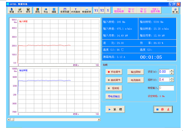 - 所有儀器通過RS485總線與電腦連接,實現對變速箱的自動加載以及對數據的集中采集。實時顯示各參數與時間之間的關系曲線,以記錄整過測試過程。