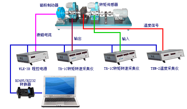 - 傳動機械測量系統通過2臺相位差式轉矩轉速傳感器及2臺TR-1C轉矩轉速采集儀采集變速箱的輸入(輸出)轉矩和轉速;用1臺TEM-2溫度采集儀采集溫升;用WLK-3B程控電源控制磁粉制動器對變速箱進行加載。