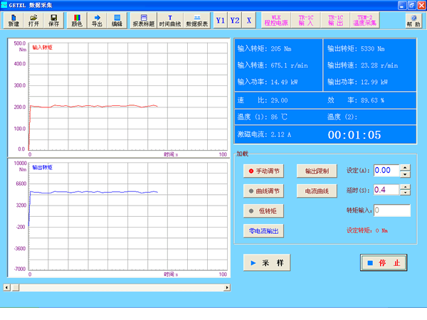 傳動機械測量系統采用磁粉制動器對減速機(擺線針輪減速機、蝸輪減速機、行星齒輪減速機等)加載,采用相位差式轉矩轉速傳感器對變速箱(減速機)進行扭矩測量、轉速測量、功率測量、機械效率測量、速比計算;采用數字溫度傳感器進行溫度測量。根據用戶要求設計減速機測試軟件,輸出減速機測試報表。該系統可以進行空載試驗、滿載試驗、效率試驗、溫升試驗。