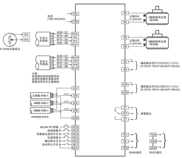 4 | PB, NB | 輸出 | 輸出24V/4A 或 36V/3A | 接B軸磁粉離合器或磁粉制動器 |