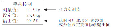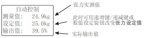 當控制器工作在自動控制模式時,自動控制指示燈(AUTO)點亮,可旋轉數值設定旋鈕或按遞增鍵/遞減鍵修改張力設定值,按AUTO/MAN鍵可切換到手動控制模式。