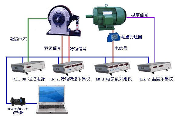 - 系統用1臺磁粉測功機加載,用1臺TR-2B轉矩轉速采集儀采集電機的輸出轉矩和轉速;用1臺AM-A型電參數采集儀采集電機的輸入電壓、電流、功率因數、頻率等參數;用1臺TEM-2溫度采集儀采集溫升;用WLK-3B程控電源控制磁粉測功機。