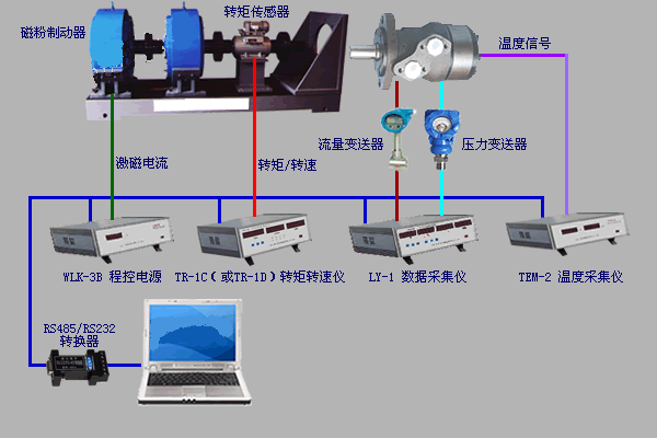 液壓馬達(dá)測試系統(tǒng)采用磁粉制動(dòng)器作加載器;采用磁電型扭矩傳感器測量液壓馬達(dá)、氣壓馬達(dá)、氣動(dòng)馬達(dá)的輸出轉(zhuǎn)矩轉(zhuǎn)速;采用流量變送器測量流量;采用壓力變送器測量液壓(氣壓);采用數(shù)字溫度傳感器測量溫度。